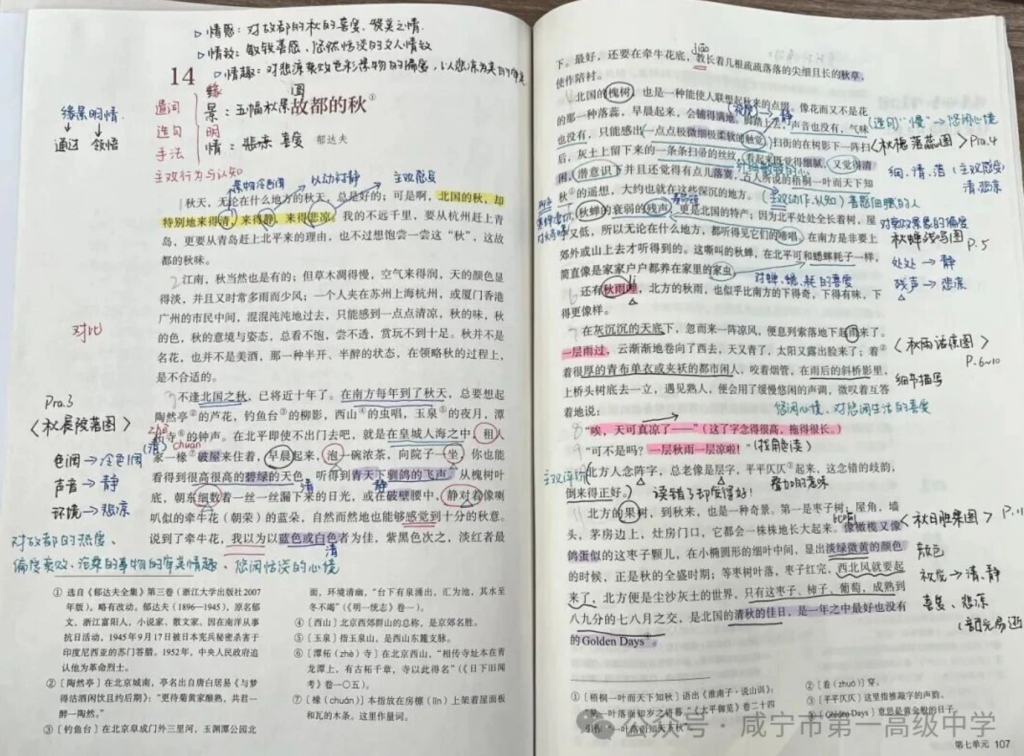 再次打开《故都的秋》,我的身份已截然不同。学生时代,我坐在台下,为字里行间那份“清、静、悲凉”的意境所打动;大学时,我特意去了北平,漫步在红墙、胡同间,文章中一行行细腻的描写忽然变得生动起来,更添一番滋味。而如今,我站上讲台,成了要引导学生走进这篇散文的语文老师,这是我作为青年教师的第一次“青蓝工程”汇报课。