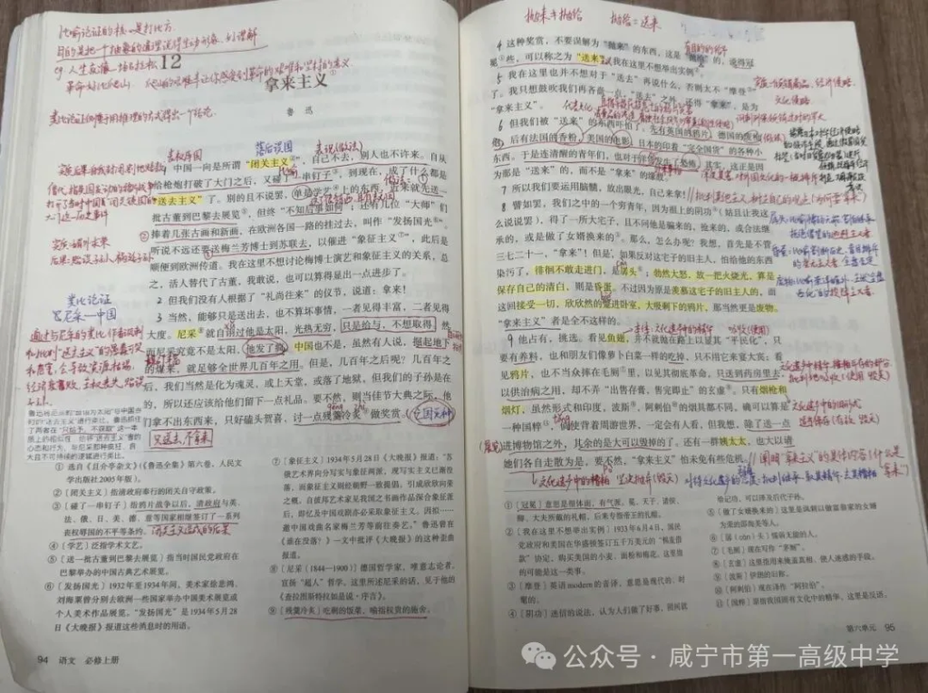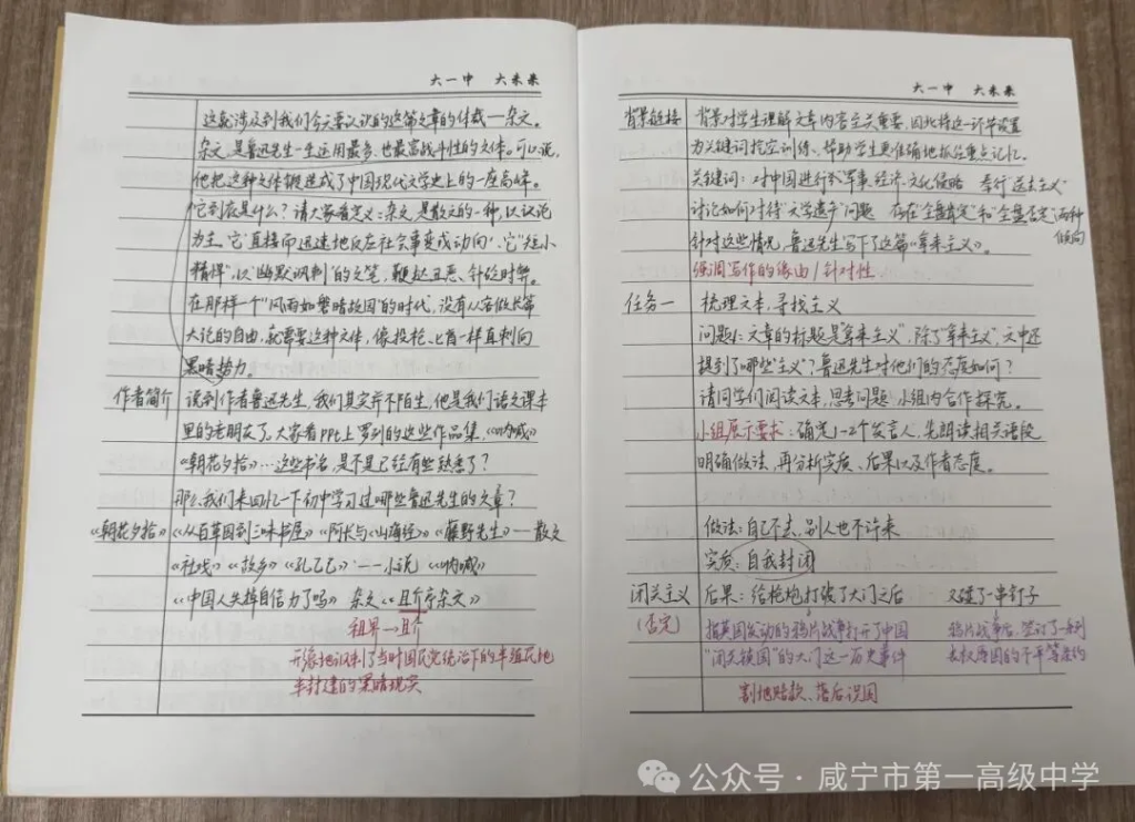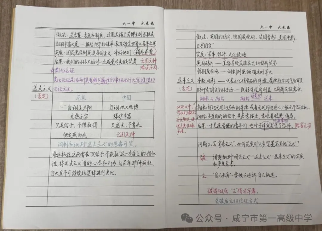 最大的惊喜来自第六小组的葛雨欣同学。在分析“送来主义”时,她敏锐捕捉到“抛来”与“抛给”这一字之差:“‘抛给’绝非随意,它带着施舍的轻蔑与侵略的目的。”我顺势追问:“是何目的?”她侃侃而谈,从德国废枪炮的军事倾销,到美国电影的文化渗透,条分缕析,直指帝国主义经济、文化侵略的实质。话音落下,教室里自发响起热烈掌声。这掌声,既是对同伴精彩见解的赞赏,更是全体同学穿透文字表象,触及时代暗流与作者深意的共鸣。正是在对“闭关”“送去”“送来”诸主义的层层“破”析中,“运用脑髓,放出眼光,自己来拿”的“拿来主义”主张,如拔云见日,自然屹立,学生也真切体悟了“先破后立”论证逻辑的力量。
