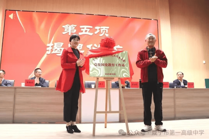 在热烈的掌声中,市关工委主任殷德才与市教育关工委主任廖晓鸣共同为“党史国史教育工作站”揭牌。红色幕布缓缓落下,金色牌匾熠熠生辉,标志着咸宁一中党史国史教育迈入新阶段。