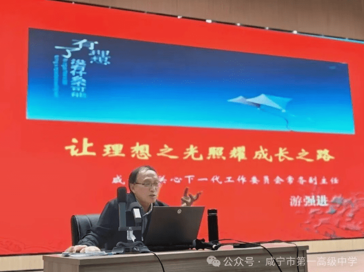 随后,市关工委常务副主任游强进为与会师生带来了一堂深刻而生动的党史国史教育课,这也是工作站正式成立后的“第一课”。游主任结合自身研究,以翔实的史料、鲜活的故事,深入浅出地讲解了党的奋斗历程与国家发展脉络。课堂上,同学们凝神聆听,在历史的回响中汲取智慧与力量。会场内报告厅内掌声不断。