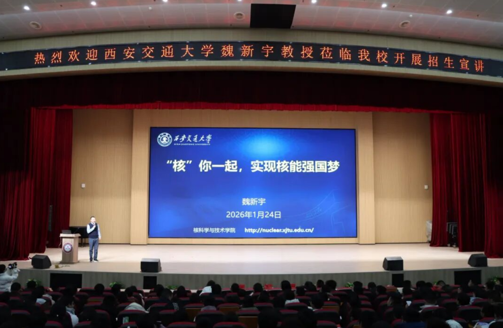 2026年1月24日晚,明德楼二楼报告厅灯火通明,气氛庄重而热烈。西安交通大学核科学与技术学院魏新宇教授应邀走进咸宁一中,为全体高一年级学子带来了一场题为《“核”你一起,实现核能强国梦》的专题讲座。本次活动旨在拓展学生科学视野,激励青年学子树立科技报国之志,在高中生心中播下“强基报国、创新奉献”的种子。